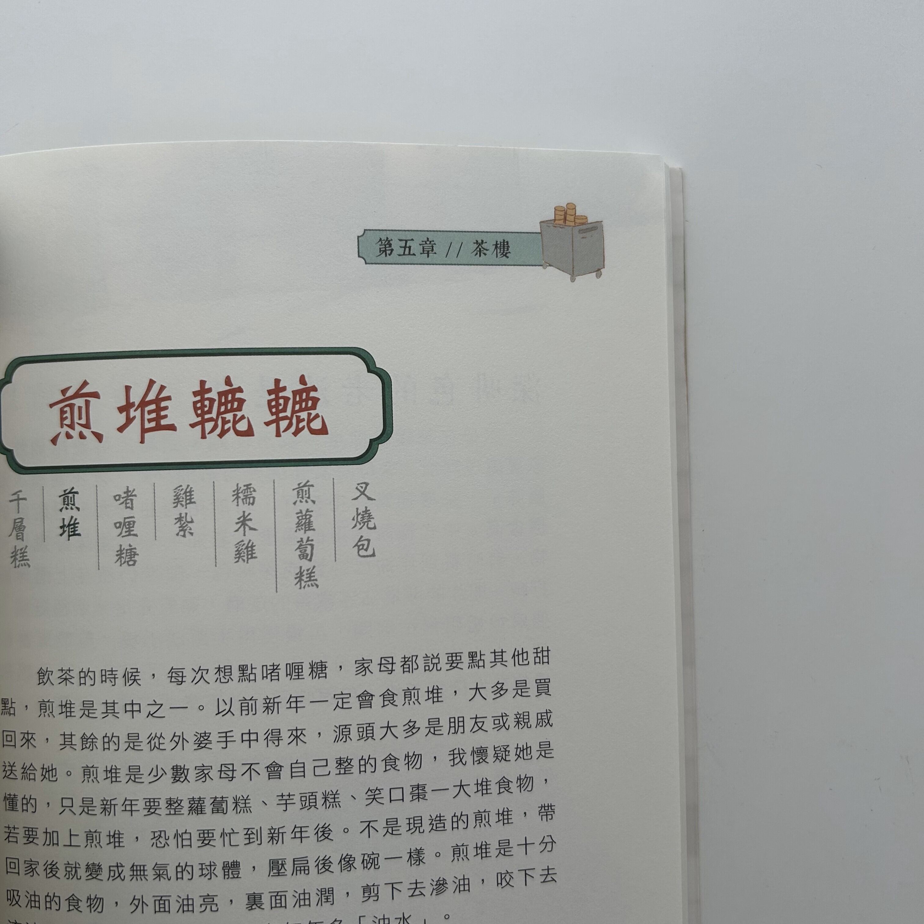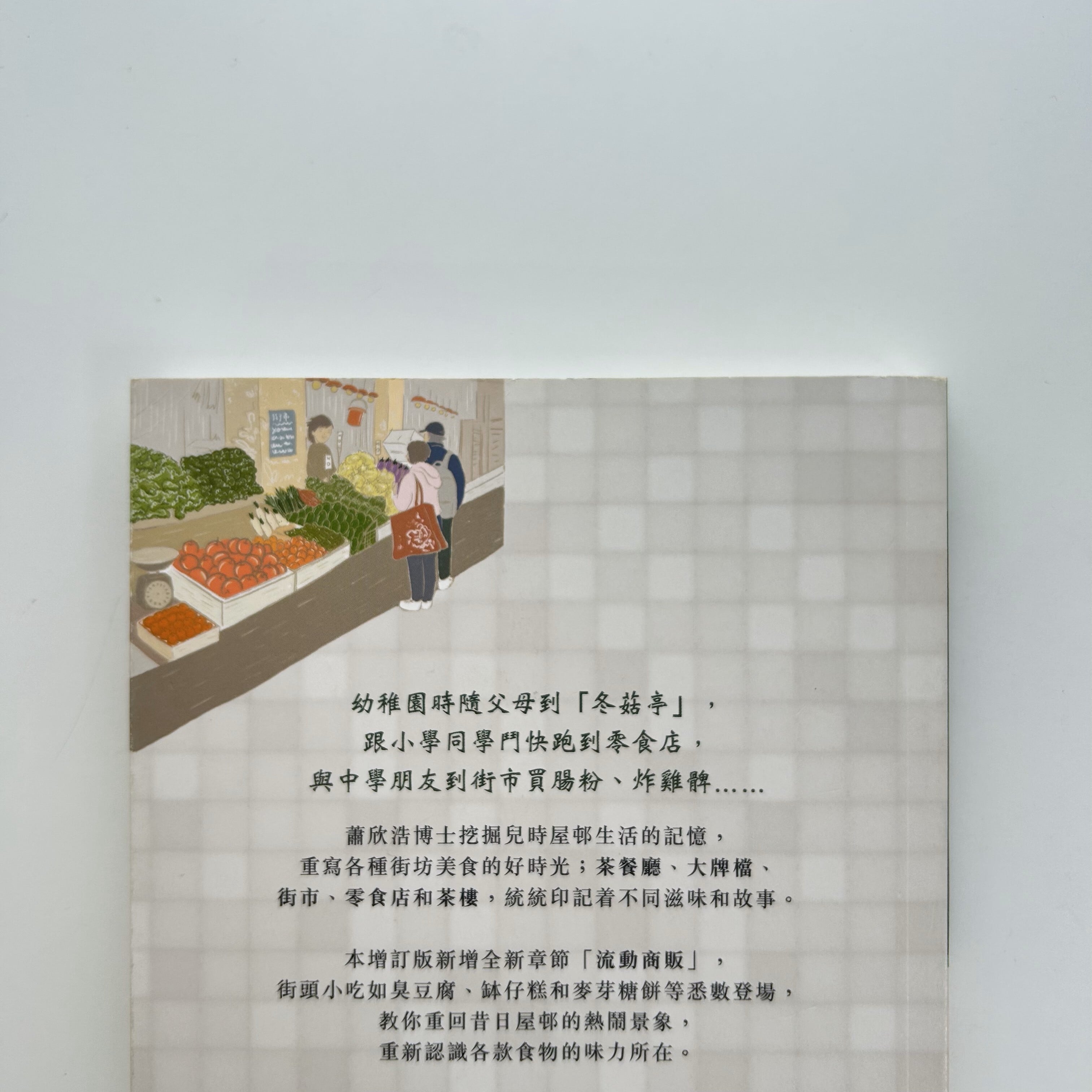 冬菇亭(屋邨の屋台)、零食店、街市(市場)、茶餐廳、大牌檔、茶樓など、庶民的な食の場が舞台となっていて、今回の増訂版では新たに「流動商販(移動式屋台)」の章が追加され、臭豆腐、缽仔糕、麥芽糖餅などの街頭小吃が登場しています。